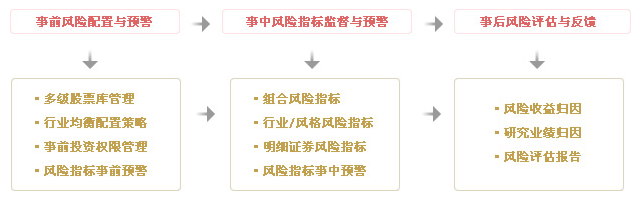 • 運(yùn)用合理有效的風(fēng)險指標(biāo)和模型,實(shí)現(xiàn)風(fēng)險事前配置和預(yù)警、事中實(shí)時監(jiān)控、事后評估和反饋的全程嵌入式投資風(fēng)險管理模式。