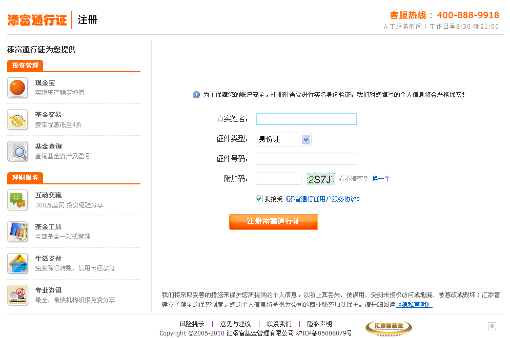 打開注冊頁面,輸入真實姓名、證件號碼及附加碼,點擊“我接受《添富通行證用戶服務協(xié)議》”;