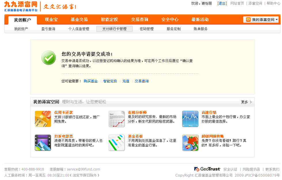 銀行卡驗證通過,您現(xiàn)在就可以通過匯添富網(wǎng)上交易平臺購買基金,享受4折費率優(yōu)惠。