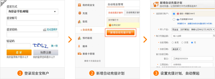 綁定工資卡,定期自動將指定金額轉(zhuǎn)入您的現(xiàn)金寶,讓您的銀行卡內(nèi)閑置資金“活”起來!助力提升收益!