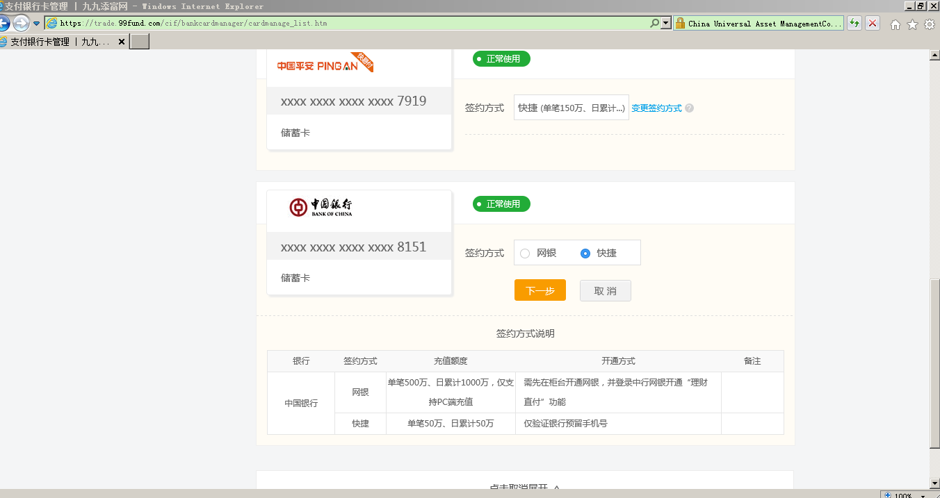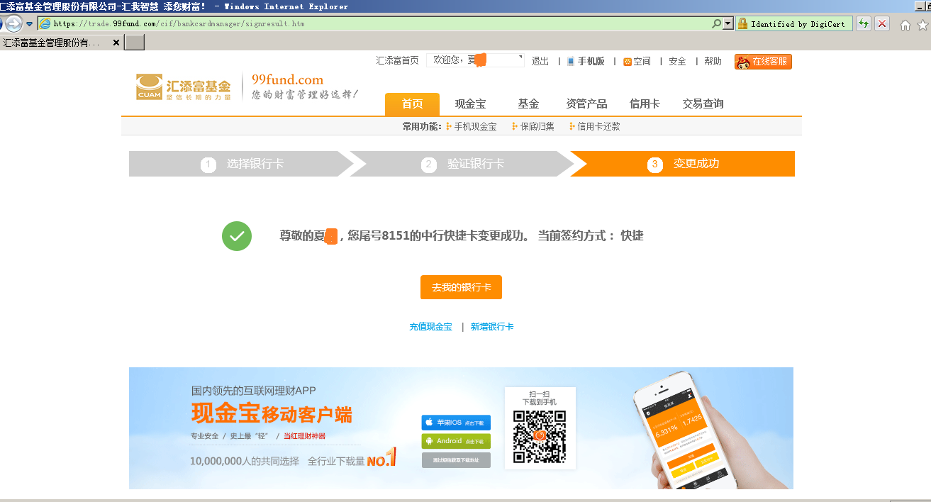 第一步 (App不支持操作)通過匯添富官網(wǎng)(www.pr70.cn)網(wǎng)頁登錄現(xiàn)金寶賬戶,點擊“首頁”-“銀行卡管理”,點擊“變更簽約方式” ,選擇“快捷”模式