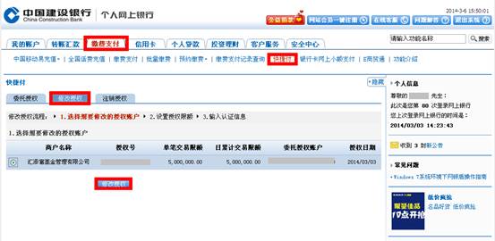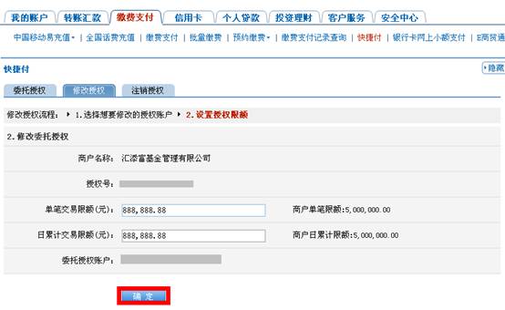 3.登錄到網(wǎng)上銀行后,點(diǎn)擊“繳費(fèi)支付”、“快捷付”、“修改授權(quán)”,選擇匯添富后點(diǎn)擊“修改授權(quán)”