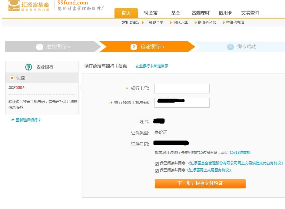 3. 輸入銀行卡號和銀行預(yù)留手機(jī)號碼,點擊下一步