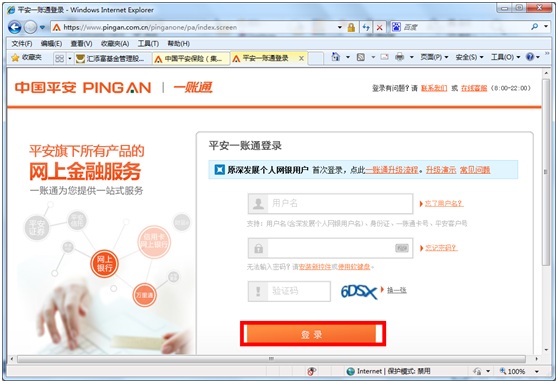 2. 輸入平安一賬通的用戶名、密碼、驗(yàn)證碼后點(diǎn)擊“登錄”按鈕