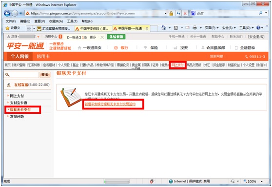 4. 在個(gè)人網(wǎng)銀頁面,點(diǎn)擊“網(wǎng)上支付”-“銀聯(lián)無卡支付”,點(diǎn)擊“新增平安銀行銀聯(lián)無卡支付交易簽約”