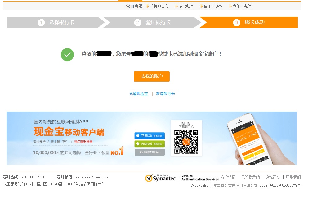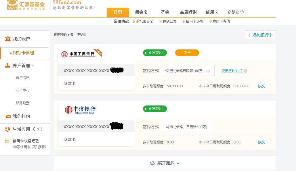5、銀行卡添加成功,可以充值現(xiàn)金寶或購買基金、理財(cái)產(chǎn)品等。
