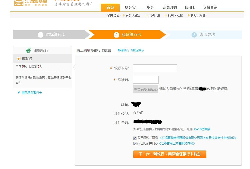 3.輸入銀行卡號,點擊獲取驗證碼輸入正確后,點擊下一步,“到銀行卡網(wǎng)頁驗證銀行卡信息”