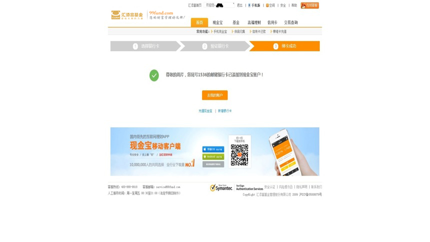 7.銀行卡添加成功,可以充值現(xiàn)金寶或購買基金、理財產(chǎn)品等