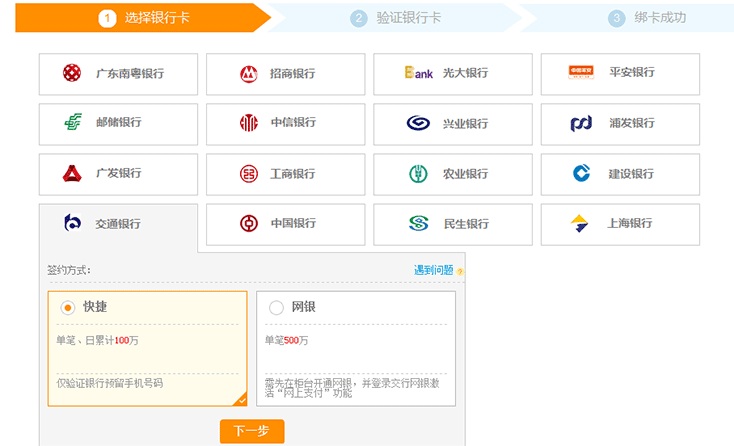 2、點擊“交通銀行”,選擇“交行快捷”,點擊“下一步”。