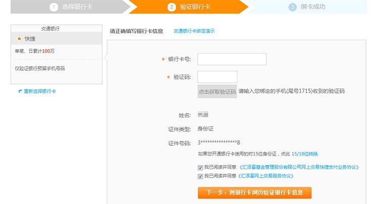 3、輸入銀行卡號及手機動態(tài)短信驗證碼,點擊“下一步:銀行網(wǎng)頁驗證銀行卡信息”。