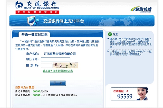 4、進入交通銀行網(wǎng)上支付平臺,在“開通一鍵支付功能”頁面,輸入銀行卡號及附加碼,點擊“下一步”。