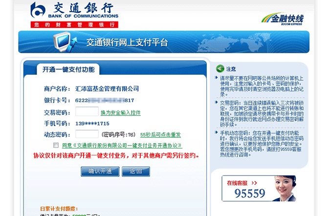 5、輸入銀行卡的交易密碼及動態(tài)密碼,點擊“確認開通”。
