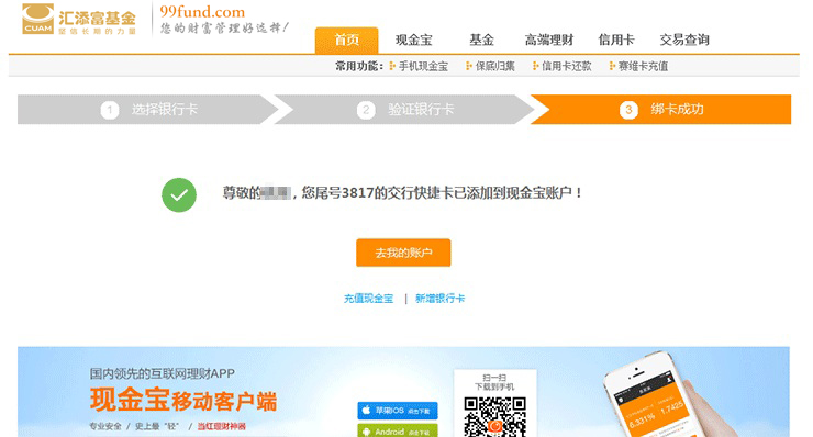 7、返回匯添富界面,銀行卡添加成功,可以充值現(xiàn)金寶、購買基金等。