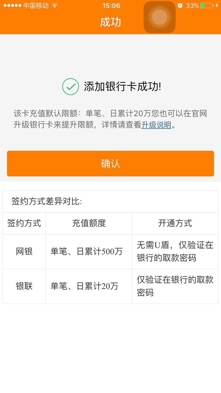 目前支持綁定銀聯(lián)模式的銀行卡:中信、民生、光大、交行、郵儲(chǔ)、平安、興業(yè)。