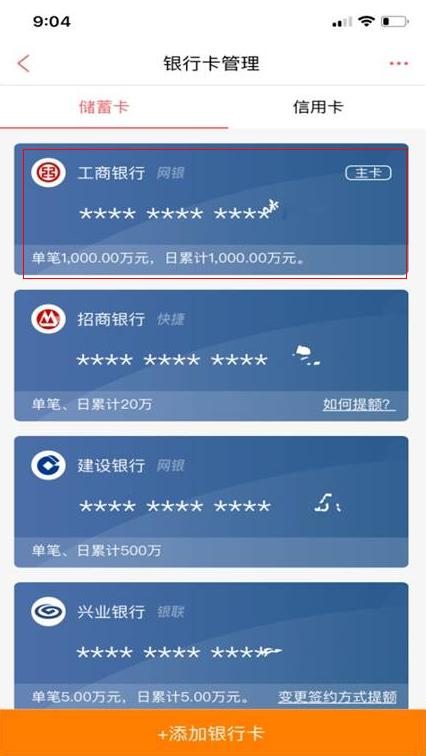 第二步:在銀行卡管理界面,點擊需要更換的銀行卡(以工商銀行卡為例)