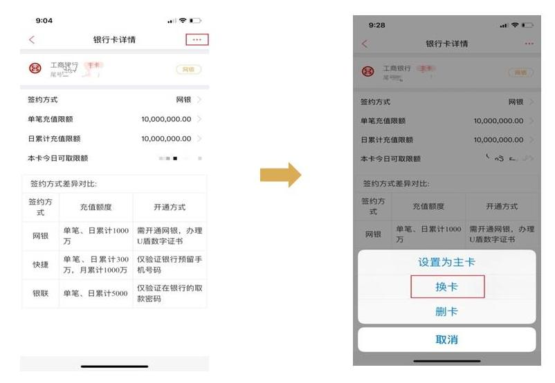 1.App端:登錄現金寶手機App—我的—銀行卡—點擊需更換的銀行卡—換卡,根據頁面提示流程操作即可。