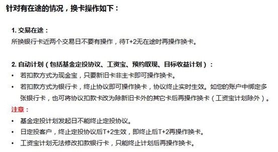 2.若您有定投協(xié)議(定投、工資寶、預約取現等)請您先暫停計劃,待換卡完成后,可重新開通相應計劃!如有在途交易請于2個交易日后再操作換卡。